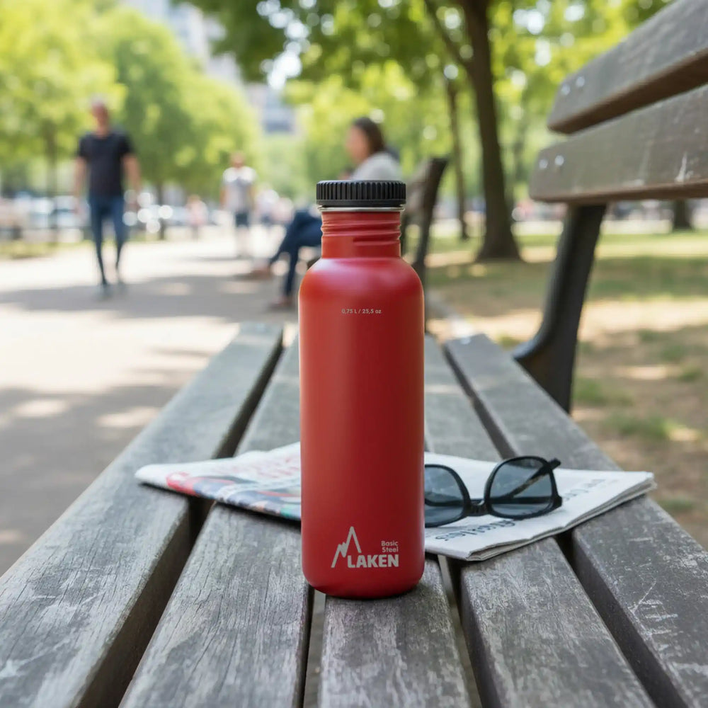Botella de acero inoxidable 18/8 de una pared, segura para uso alimentario y de estética actual. Incorpora un tapón de rosca de acero inoxidable, práctico y con diseño antifugas probado.